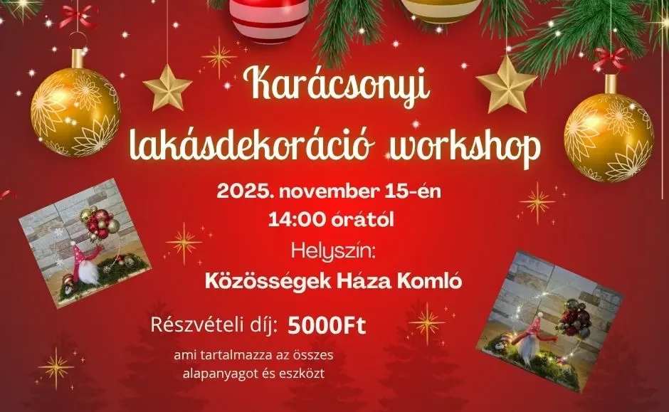 November 15-én 14:00 órától karácsonyi lakásdekoráció készítő workshopon vehetnek részt a kézműveskedést szeretők. Egy igazi kreatív, alkotásban elmerülő, karácsonyra hangolódós délután tökéletes barátnős, vagy anya-lánya program. További információ és jelentkezés a plakáton szereplő elérhetőségeken. Érdemes sietni, mert a helyek korlátozott...