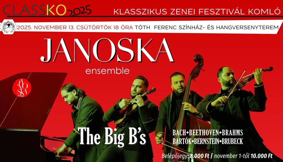 A nemzetközi hírű JANOSKA ensemble most először érkezik Komlóra, hogy a ClassiKo fesztivál színpadán varázsolja el a közönséget. A három Janoska testvér (Ondrej, Roman és Frantisek) és Darvas Julius bőgőművész egyedi „Janoska Style”-ja világszerte rajongókat hódít: klasszikus mesterművek kelnek új életre jazz, pop és népzenei színekkel, mindezt lenyűgöző virtuozitással és improvizációval fűszerezve. A formáció világszerte hatalmas sikert aratott. Koncertjeiket olyan helyszíneken adhatták elő, mint pl. a londoni Royal Albert Hall vagy a New York-i Carnegie Hall.