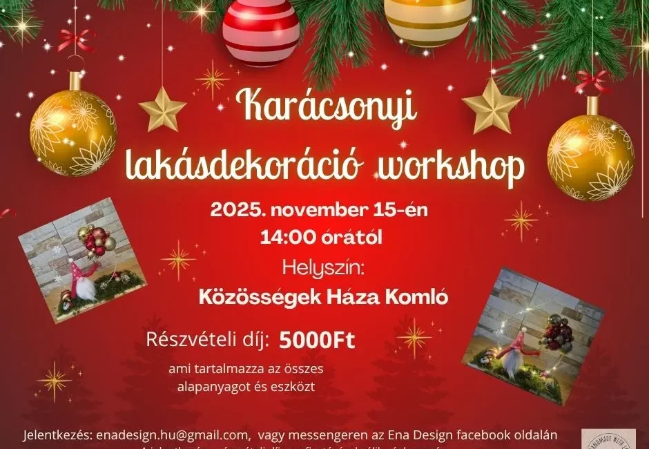 November 15-én 14:00 órától karácsonyi lakásdekoráció készítő workshopon vehetnek részt a kézműveskedést szeretők. Egy igazi kreatív, alkotásban elmerülő, karácsonyra hangolódós délután tökéletes barátnős, vagy anya-lánya program. További információ és jelentkezés a plakáton szereplő elérhetőségeken. Érdemes sietni, mert a helyek korlátozott számban elérhetők.