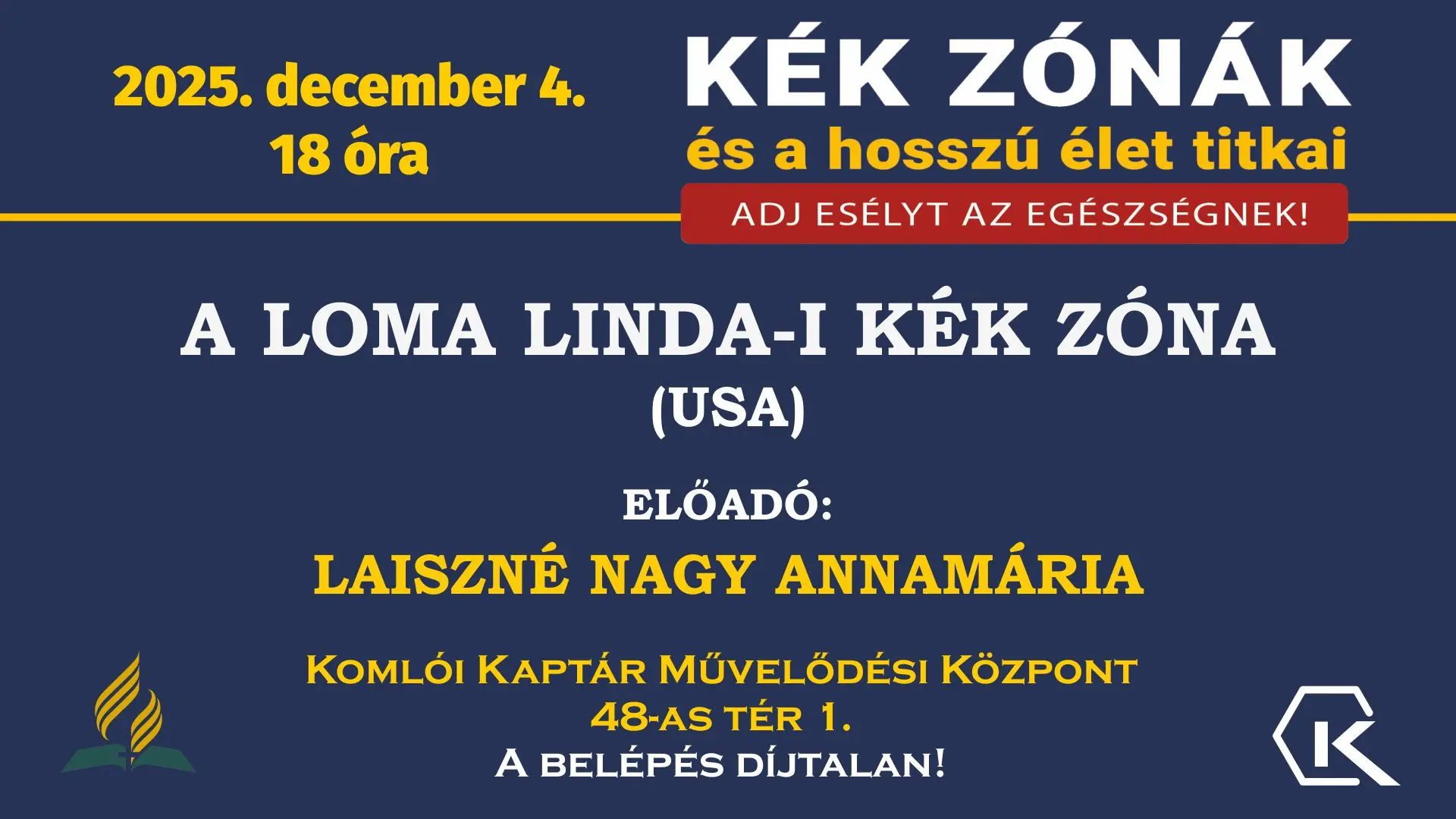 Utolsó Kék zónákat bemutató előadásunkon  Loma Linda-ról  (Egyesült Államok) hallhatnak. Ez a kék zóna kicsit más, mint a korábbi előadásokban megismert kék zónák, hiszen modern környezetben tudták megvalósítani azokat az elveket, amik az egészséges és hosszú élet alappillérei.