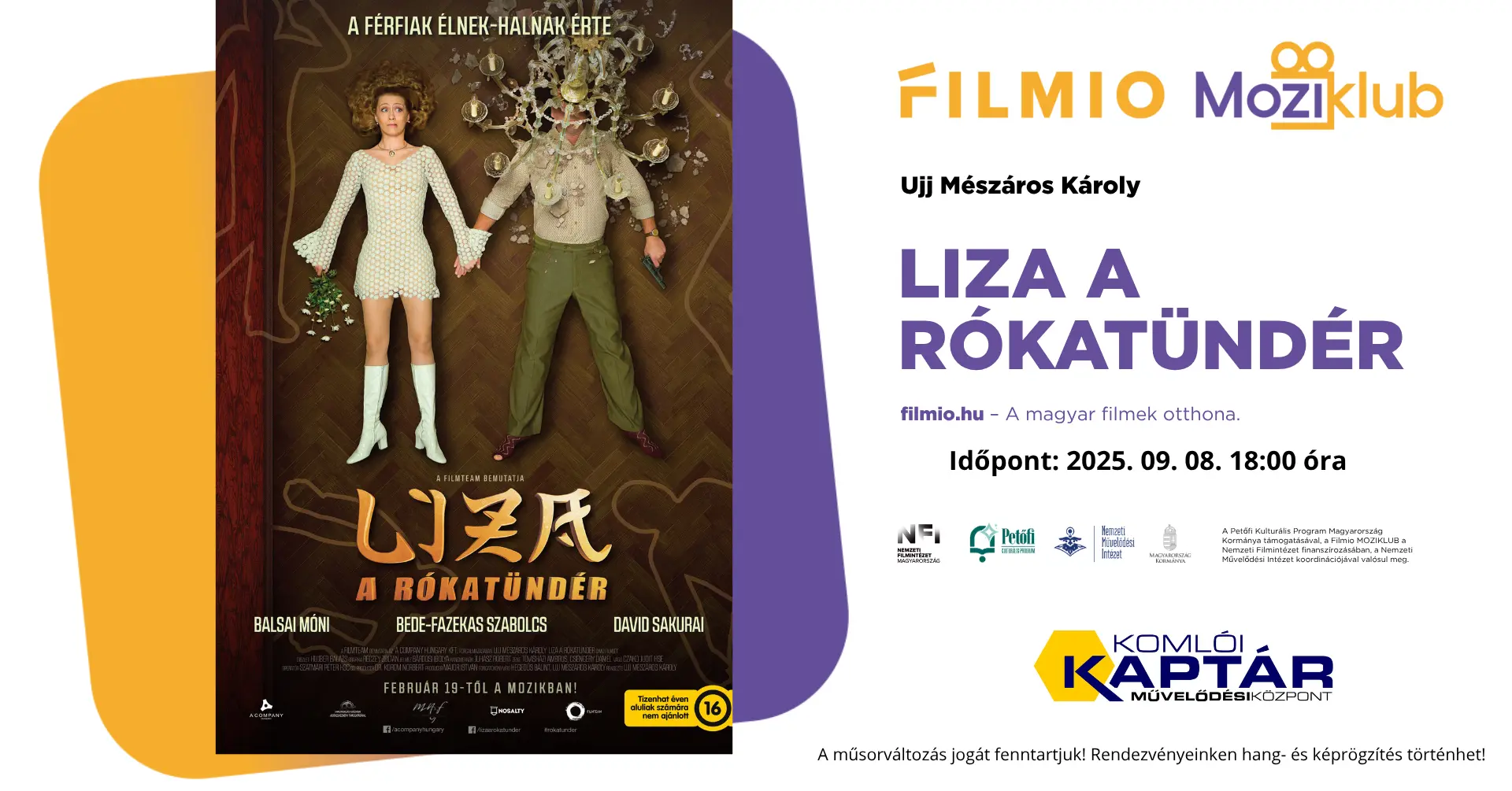 Kedves Közönségünk! Moziklub programsorozatunk szeptember 8-án folytatódik egy valódi filmcsemegével. A Liza a rókatündér című alkotást láthatják, mely Ujj Mészáros Károly első nagyjátékfilmje. Történetét tekintve megidézi a japán kultúrtörténetet, s ezzel együtt egészen különleges formavilágot teremt, amelyben összeütközik a realitás és a szürreális álomképszerű jelentek. A szerethető karakterek, a különleges vizuális effektek, a feketehumor, a japán popdalok keveredése egyedi hangulatot kölcsönöz a filmnek. Érdemes lesz ismét velünk tartani! Jegyek már kaphatók!