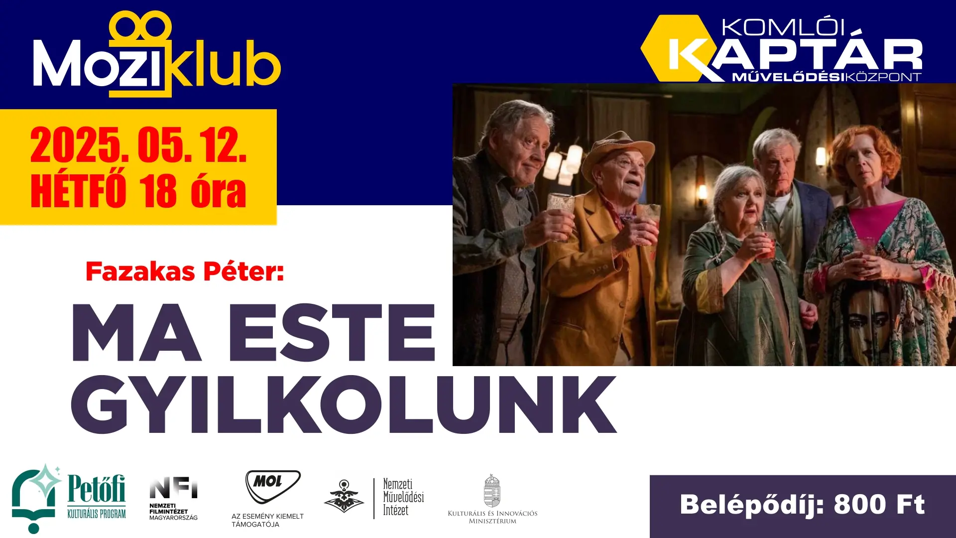 Az első vetítésre – május 12-én 18:00 órakor – mi választottunk egy fergeteges krimi vígjátékot. A Ma este gyilkolunk című filmben a színészóriások mellett az izgalmas téma ígér biztos szórakozást.