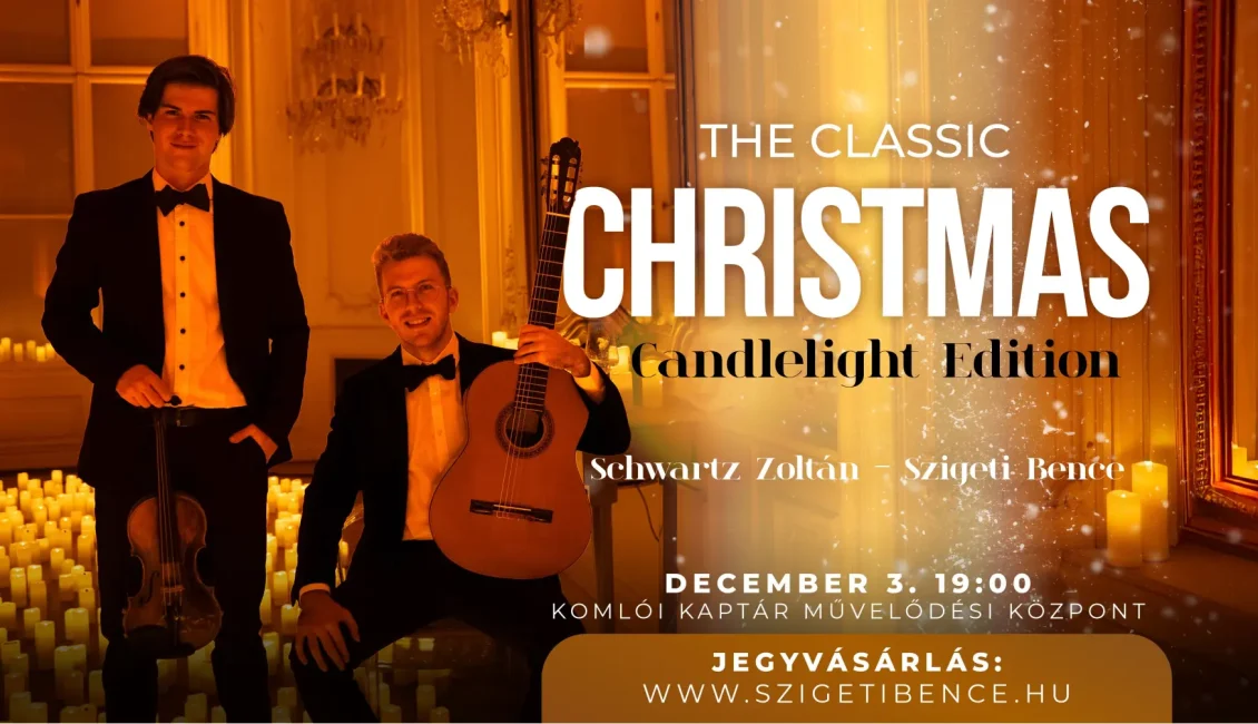 Szeretettel ajánljuk ehhez „The classic christmas candlelight edition” Szigeti Bence gitárművész és Schwartz Zoltán hegedűművész gyertyafényes koncertjét 2025. december 3-án a Kaptár Művelődési Központ Kamaratermében 19 órai kezdettel.